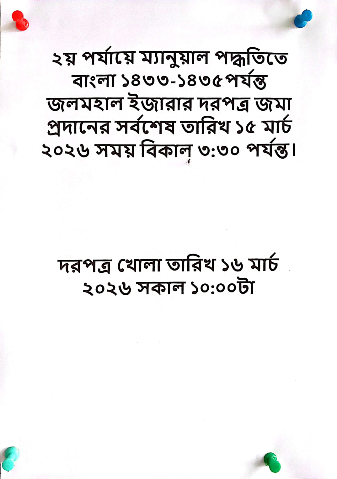 ****২য় পর্যায়ে ম্যানুয়াল পদ্ধতিতে বাংলা ১৪৩৩-১৪৩৫ পর্যন্ত জলমহাল ইজারার দরপত্র জমা প্রদানের সর্বশেষ তারিখ ১৫ মার্চ ২০২৬ সময় বিকাল ৩.৩০ পর্যন্ত।**** ****** দরপত্র খোলা তারিখ ১৬ মার্চ ২০২৬ সকাল ১০.০০ টা******